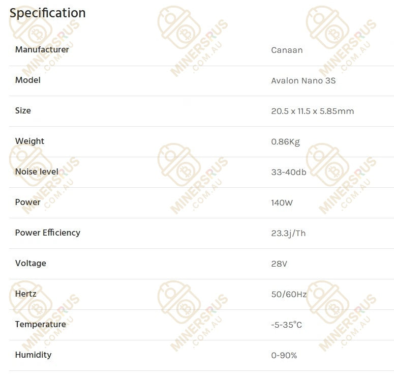 Step into the world of Bitcoin mining with the Canaan Avalon Nano 3S â a sleek, energy-efficient ASIC miner designed for hobbyists, beginners, and anyone looking to mine from the comfort of home. With a 6 TH/s hashrate and ultra-low 140W power consumption, this miner delivers serious performance without the noise or bulk of industrial rigs.